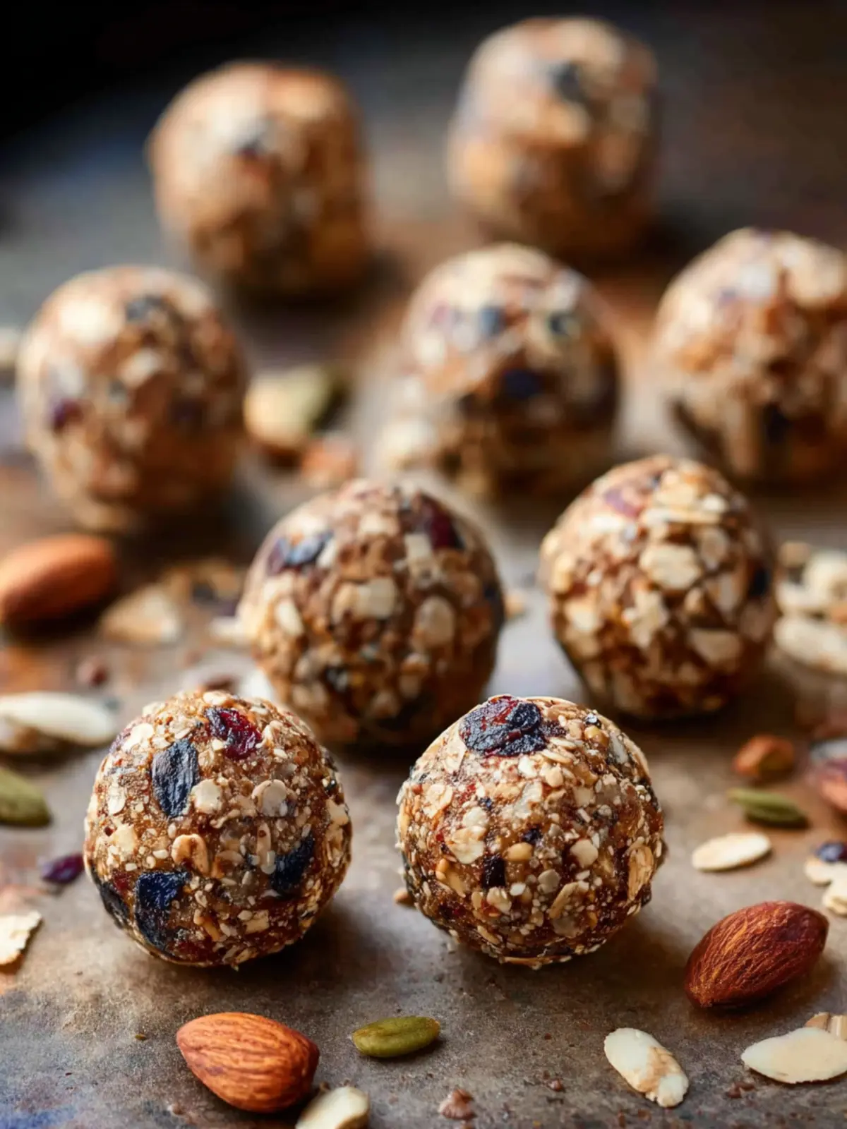 These delicious energy bites are packed with nuts, chocolate, and dried fruits.